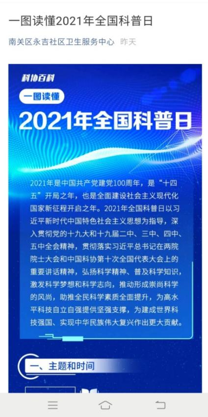 永吉社区卫生服务中心志愿者围绕建党百年向居民介绍科技创新、科学普及在党和国家事业发展、社会文明进步和人民生活水平提升等方面取得的辉煌成就,弘扬科学精神,普及生态文明知识,倡导简约适度、绿色低碳的生活方式,引导居民增强节约意识、环保意识、生态意识。着重聚焦健康文明生活方式的养成、科学防疫、儿童青少年和老年健康方面向居民进行了宣传和科普。活动中还向居民介绍和解读了《全民科学素质行动规划纲要(2021-2035年)》并发放了宣传手册。并在公众号上普及了全国科普日的知识,线上线下的开展普及了科学知识,弘扬了科学精神,有助于激发人民群众的科学梦想和科学志向