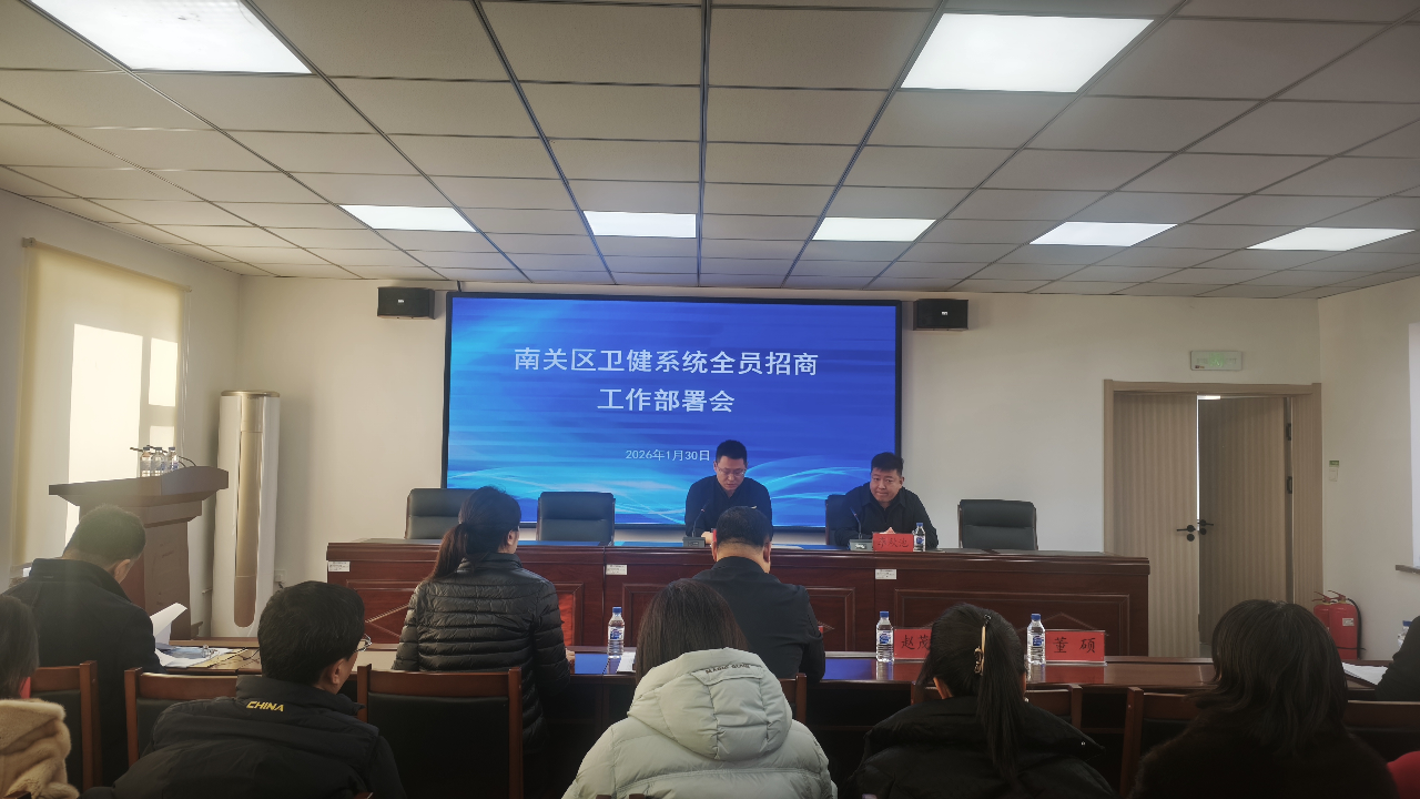2026年1月30日,南关区卫生健康局召开卫健系统全员招商工作部署会,会议由区卫健局副局长赵茂鑫主持,局党组成员、局机关全体干部职工、基层单位主要负责人参加会议,并特邀贸促会副会长李秋池进行工作指导。