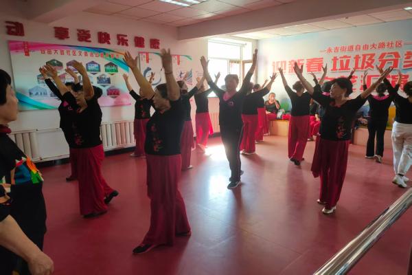 近日,永吉街道内热闹非凡。居民表演者在后台紧张筹备,整理舞服,反复核对动作,个个精神饱满,整装待发。伴随着激昂的音乐,由辖区居民组成的表演队身着统一舞服登场,队员们迈着整齐的步伐,伴随着《我和我的祖国》的节奏变化变换队形,时而舒展手臂如展翅飞鸟,时而围成圆圈象征团结,每一个舞姿都饱含对祖国的祝福、对节日的期盼,现场氛围热烈又温馨。